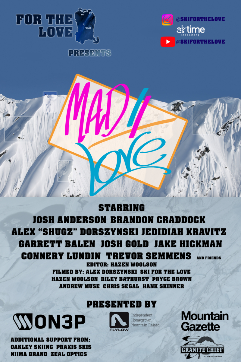It’s year three for Ski for the Love, so what’s different? Lots, but also nothing. It’s still the same ski bums. We still Ski For The Love, but we had so much fun showing everyone Home, Sick! we’ve gotta do it again. Emotions can run high in the mountains: navigating dangerous terrain, coordinating shots and zones, nailing your line. Sometimes you love it, sometimes it grinds your gears to a stop 20 miles deep on a glacier. We’ve got Mad Love for all of it and for all of you. We are supported by the Mountain Gazette, FlyLow Gear, ON3P Skis, Granite Chief Ski & Mountain Shop, Niima Brand, and Praxis Skis. Mad Love to you all!